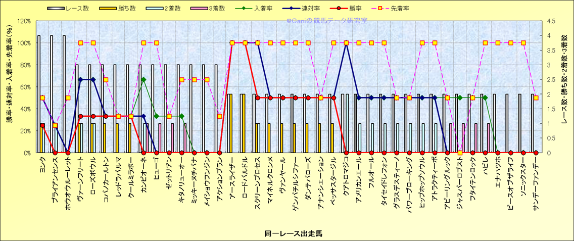 ライバル(相性)解析 同一レースに下記馬が出走した場合の成績とその馬に先着する先着率 |