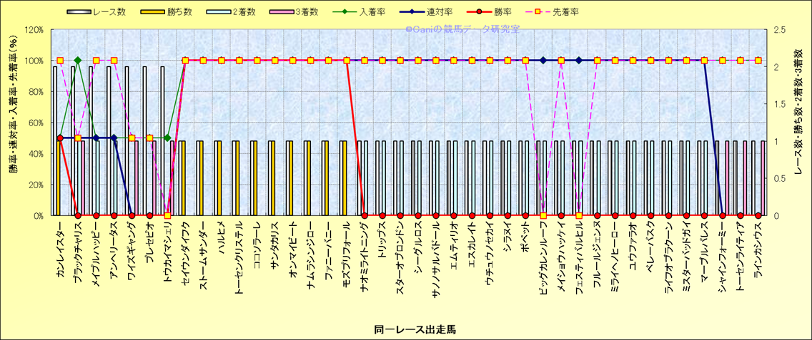 ライバル(相性)解析 同一レースに下記馬が出走した場合の成績とその馬に先着する先着率 |