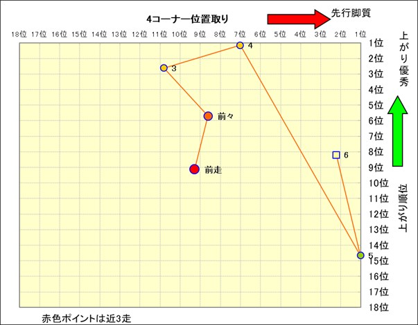 近走における4コーナーでの位置取りと上がり順位(頭数補正後) |