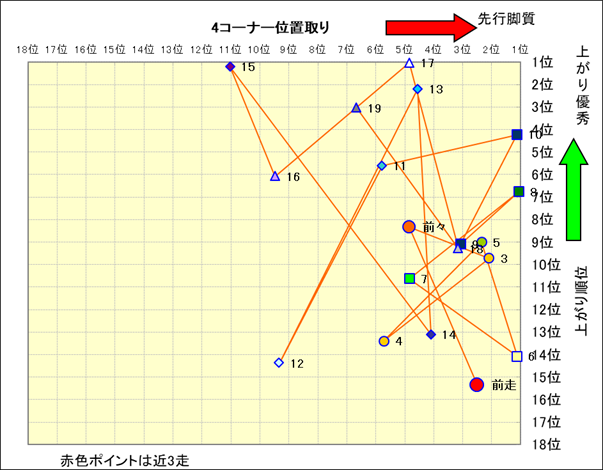 近走における4コーナーでの位置取りと上がり順位(頭数補正後) |