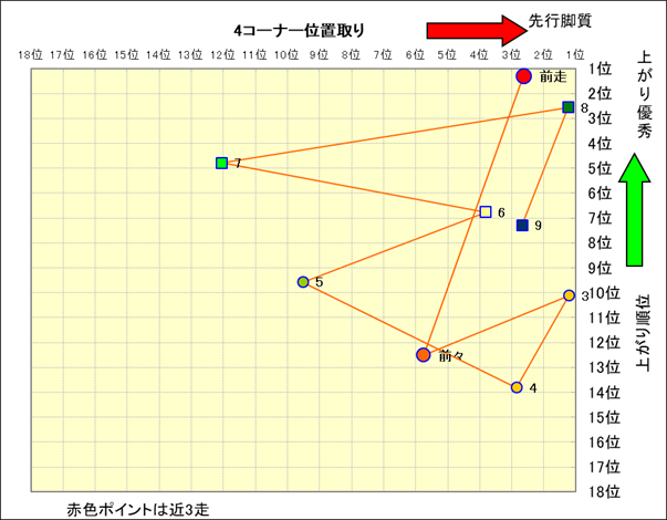 近走における4コーナーでの位置取りと上がり順位(頭数補正後) |