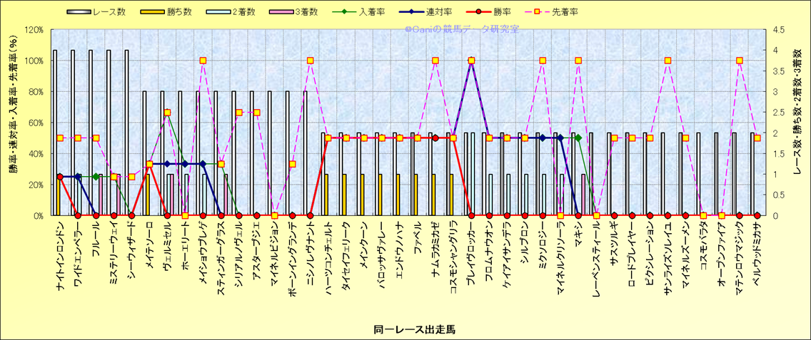 ライバル(相性)解析 同一レースに下記馬が出走した場合の成績とその馬に先着する先着率 |