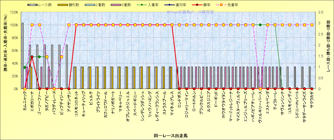 ライバル(相性)解析 同一レースに下記馬が出走した場合の成績とその馬に先着する先着率 |