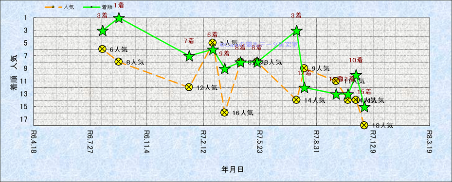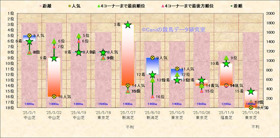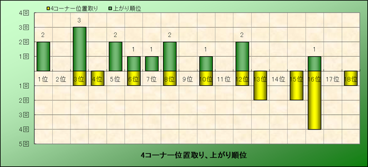 脚質解析 近20レースの4コーナーでの位置取りと上がり順位(頭数補正後) |