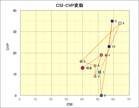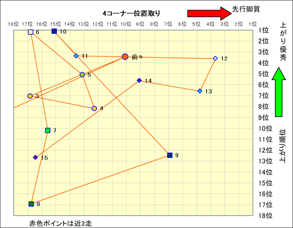 近走における4コーナーでの位置取りと上がり順位(頭数補正後) |