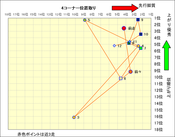 近走における4コーナーでの位置取りと上がり順位(頭数補正後) |