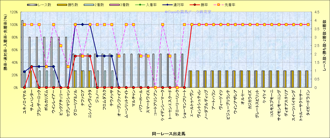 ライバル(相性)解析 同一レースに下記馬が出走した場合の成績とその馬に先着する先着率 |