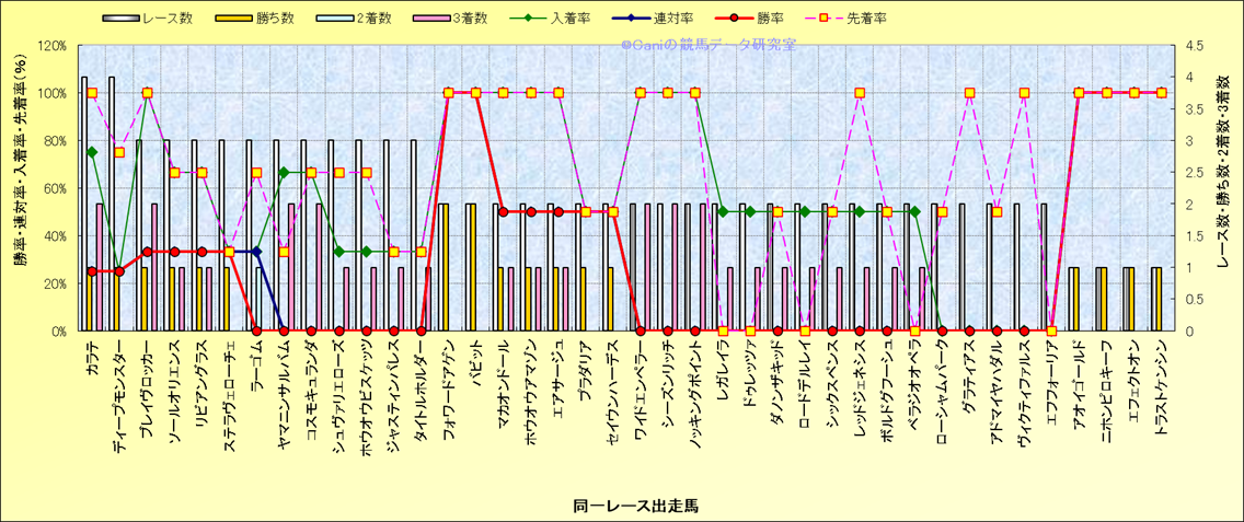 ライバル(相性)解析 同一レースに下記馬が出走した場合の成績とその馬に先着する先着率 |