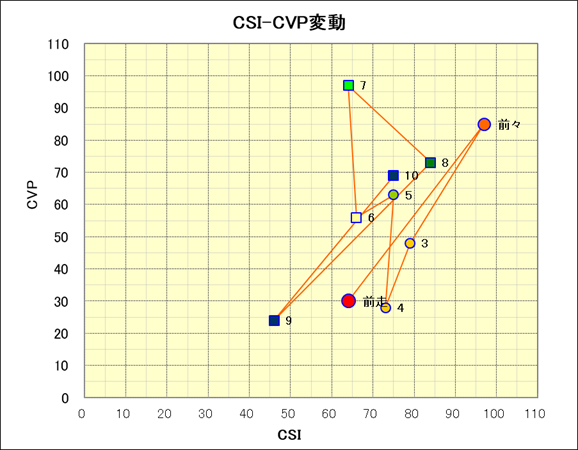近走における4コーナーでの位置取りと上がり順位(頭数補正後) |