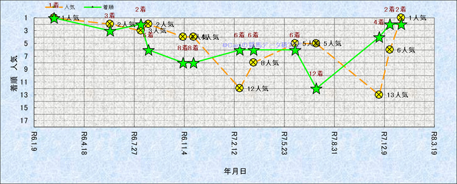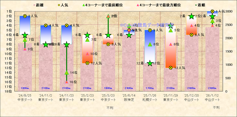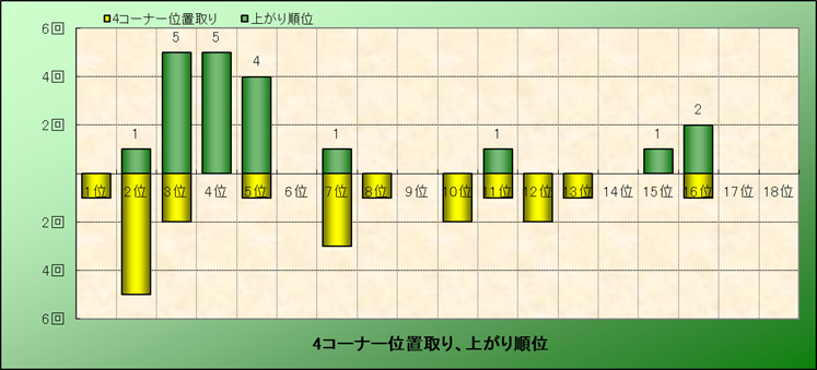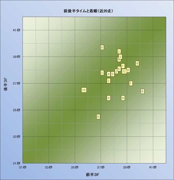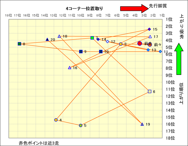 脚質解析 近20レースの4コーナーでの位置取りと上がり順位(頭数補正後) |