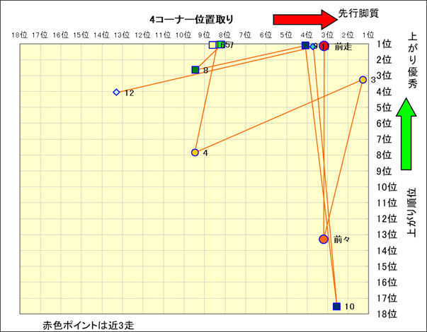近走における4コーナーでの位置取りと上がり順位(頭数補正後) |