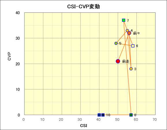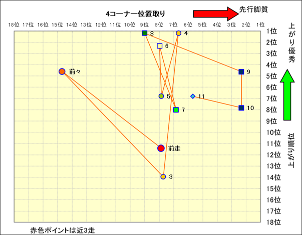 近走における4コーナーでの位置取りと上がり順位(頭数補正後) |