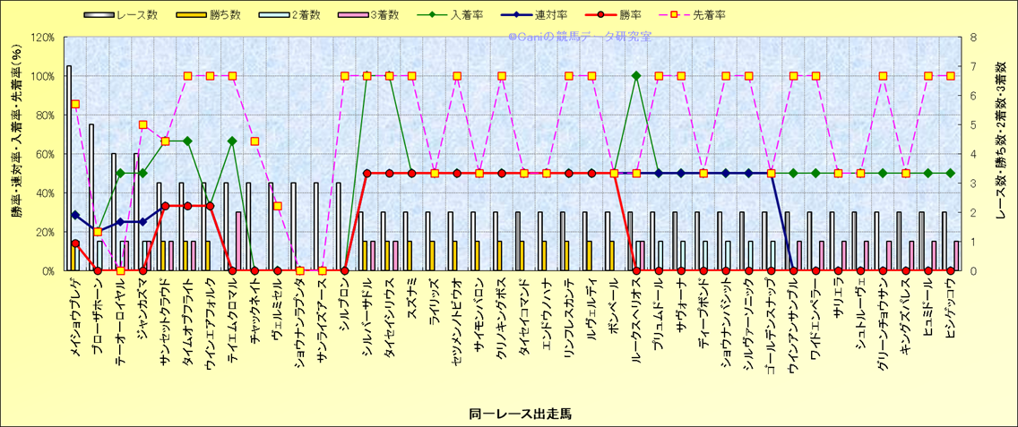 ライバル(相性)解析 同一レースに下記馬が出走した場合の成績とその馬に先着する先着率 |