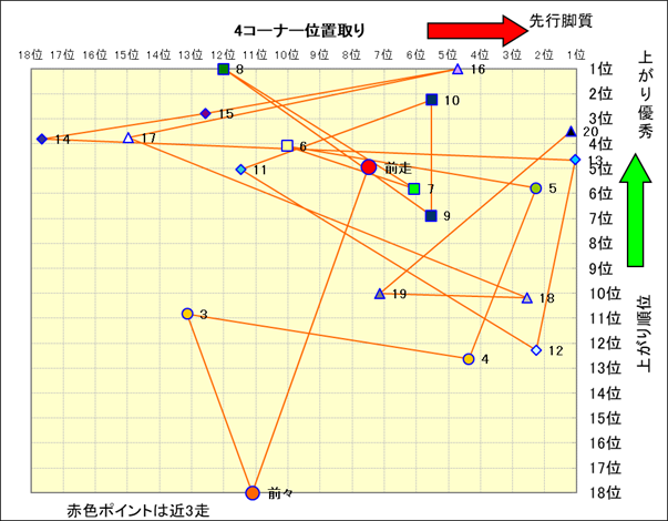 脚質解析 近20レースの4コーナーでの位置取りと上がり順位(頭数補正後) |