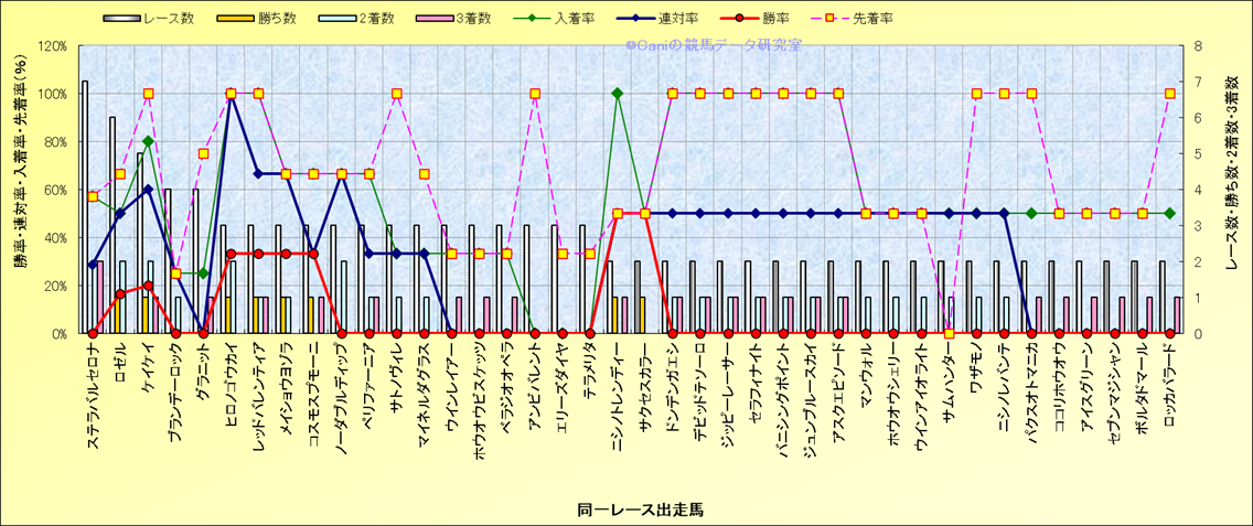 ライバル(相性)解析 同一レースに下記馬が出走した場合の成績とその馬に先着する先着率 |