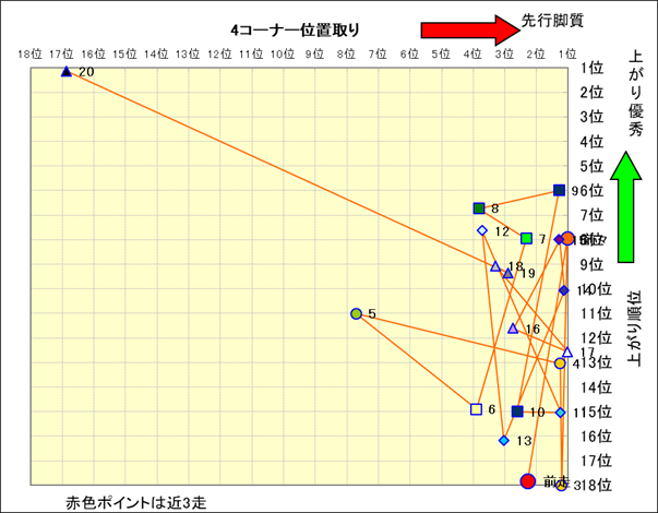 脚質解析 近20レースの4コーナーでの位置取りと上がり順位(頭数補正後) |