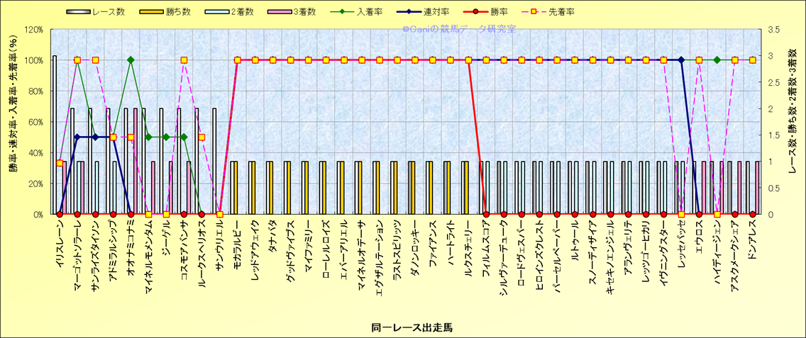 ライバル(相性)解析 同一レースに下記馬が出走した場合の成績とその馬に先着する先着率 |