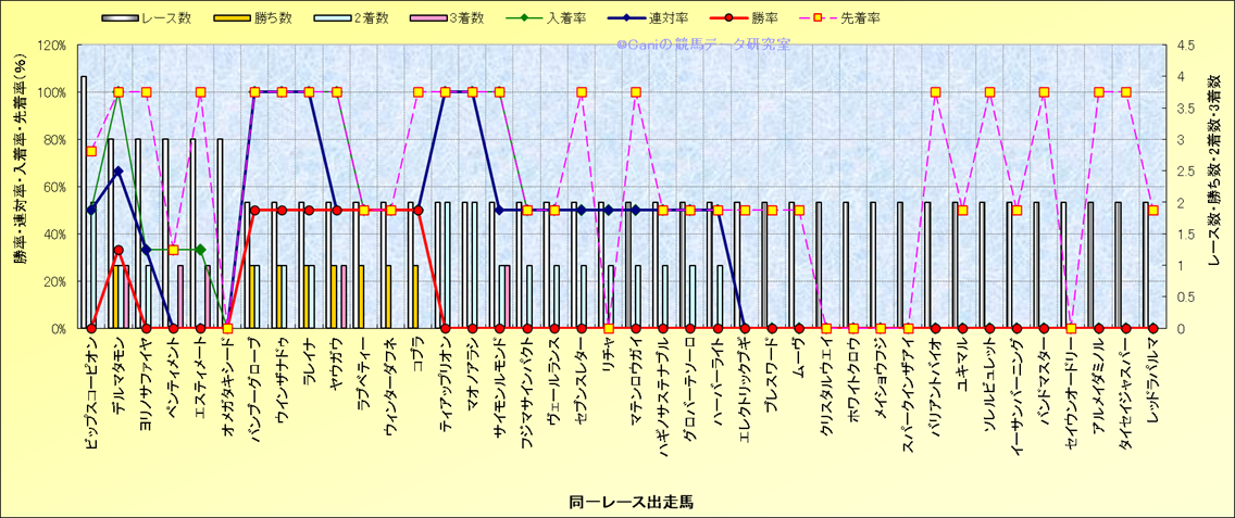 ライバル(相性)解析 同一レースに下記馬が出走した場合の成績とその馬に先着する先着率 |