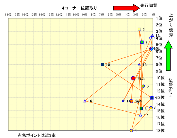 近走における4コーナーでの位置取りと上がり順位(頭数補正後) |