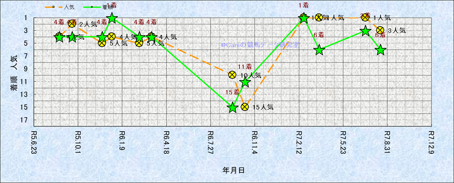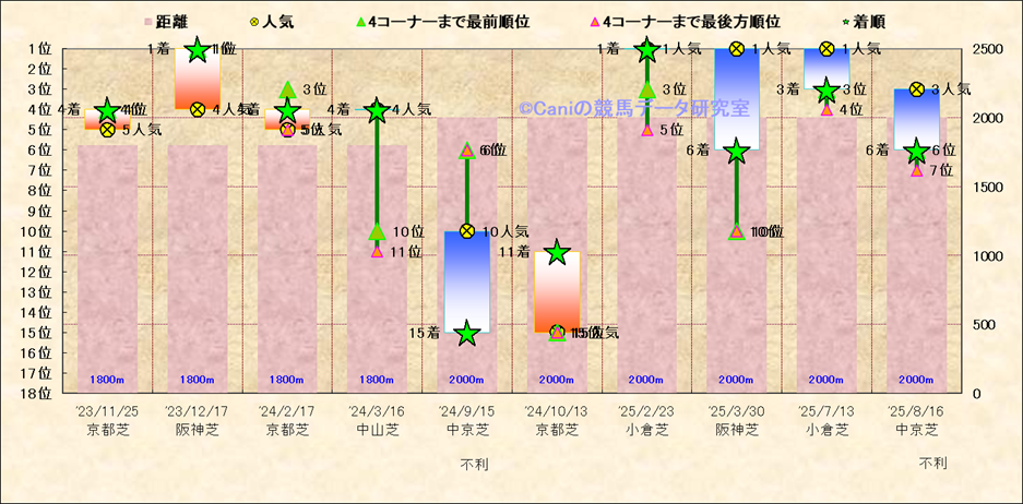 脚質解析 近20レースの4コーナーでの位置取りと上がり順位(頭数補正後) |