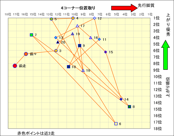 脚質解析 近20レースの4コーナーでの位置取りと上がり順位(頭数補正後) |