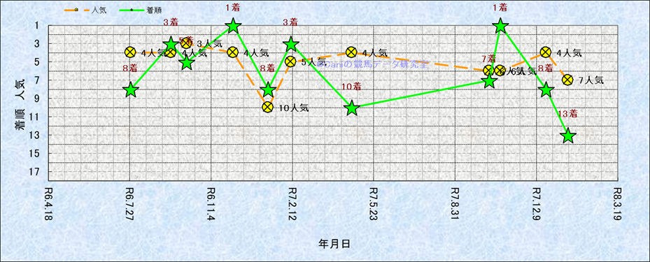 脚質解析 近20レースの4コーナーでの位置取りと上がり順位(頭数補正後) |