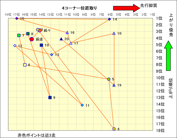 脚質解析 近20レースの4コーナーでの位置取りと上がり順位(頭数補正後) |