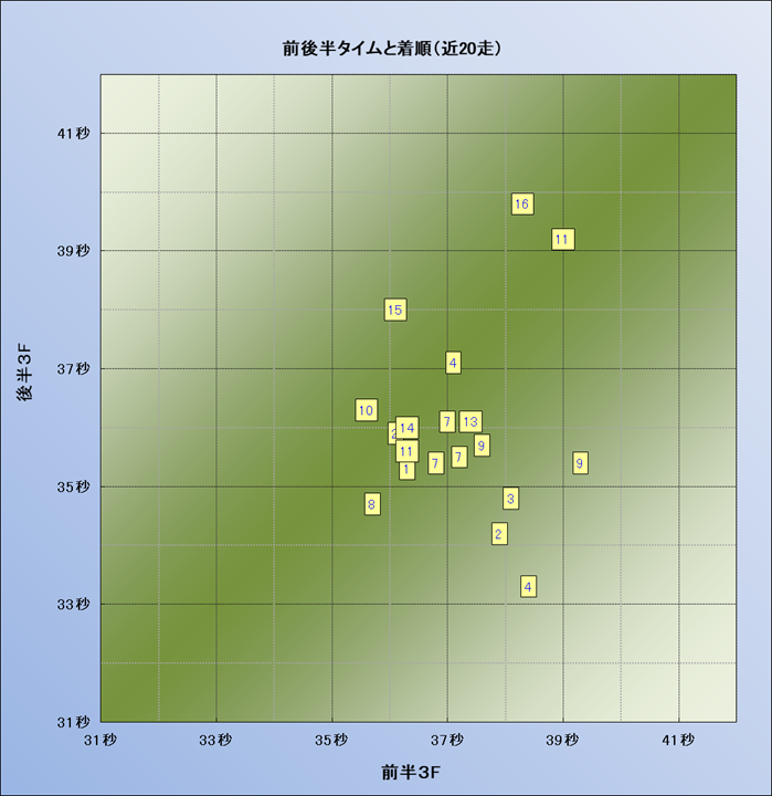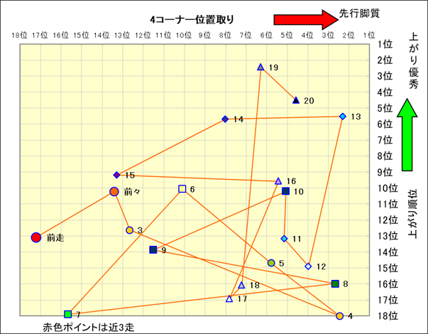 脚質解析 近20レースの4コーナーでの位置取りと上がり順位(頭数補正後) |