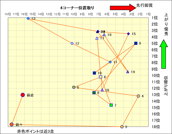 脚質解析 近20レースの4コーナーでの位置取りと上がり順位(頭数補正後) |