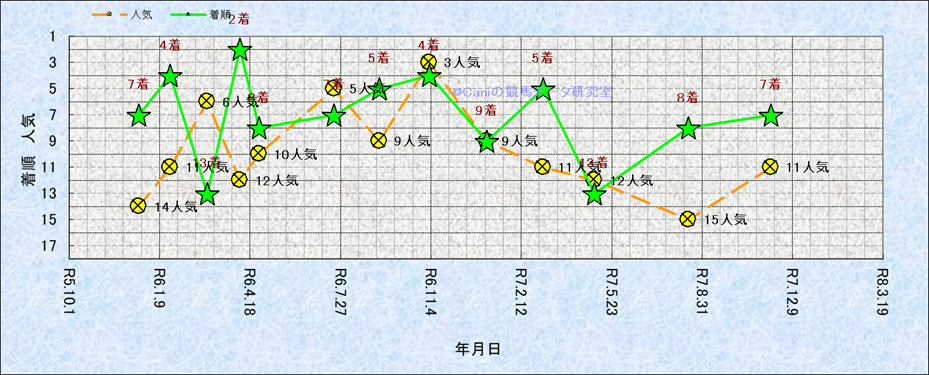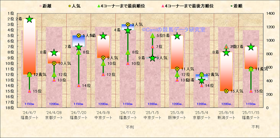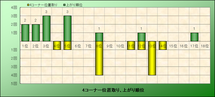 脚質解析 近20レースの4コーナーでの位置取りと上がり順位(頭数補正後) |