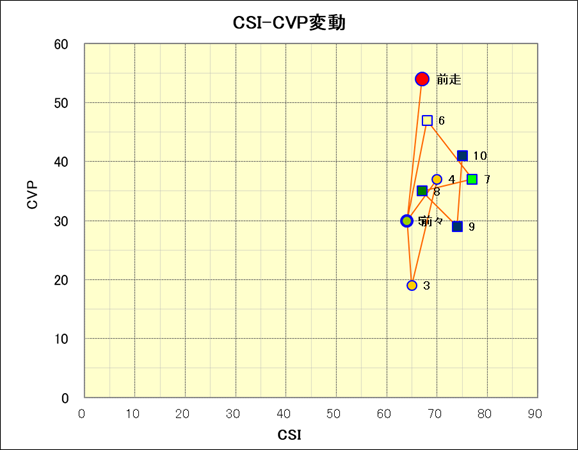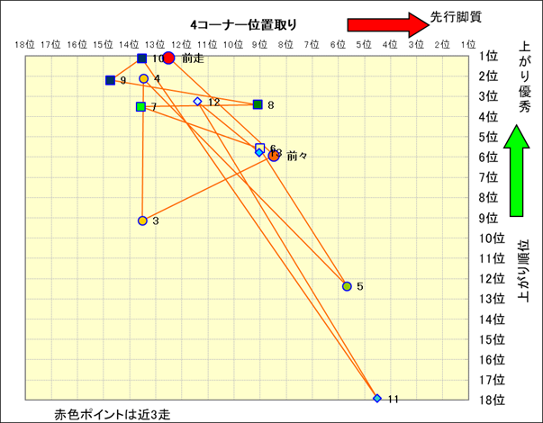 近走における4コーナーでの位置取りと上がり順位(頭数補正後) |