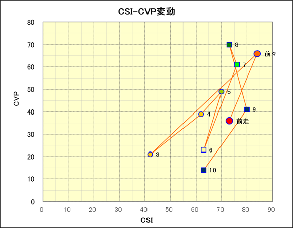 近走における4コーナーでの位置取りと上がり順位(頭数補正後) |