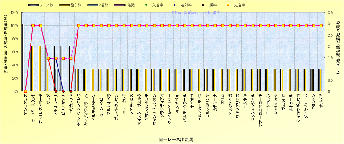 ライバル(相性)解析 同一レースに下記馬が出走した場合の成績とその馬に先着する先着率 |