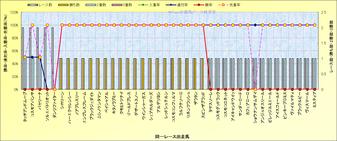 ライバル(相性)解析 同一レースに下記馬が出走した場合の成績とその馬に先着する先着率 |