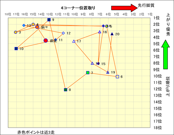 近走における4コーナーでの位置取りと上がり順位(頭数補正後) |