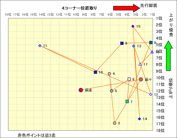 近走における4コーナーでの位置取りと上がり順位(頭数補正後) |