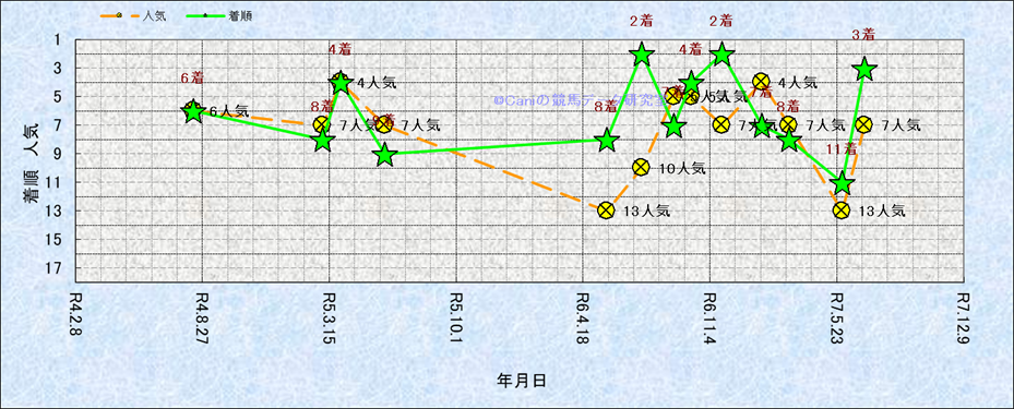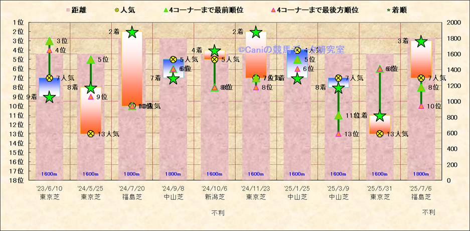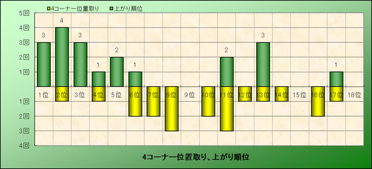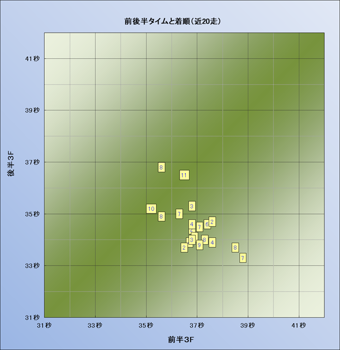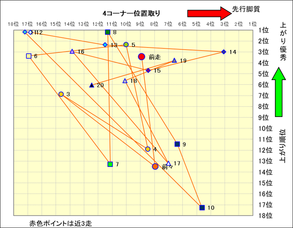 脚質解析 近20レースの4コーナーでの位置取りと上がり順位(頭数補正後) |