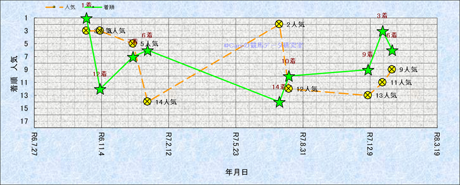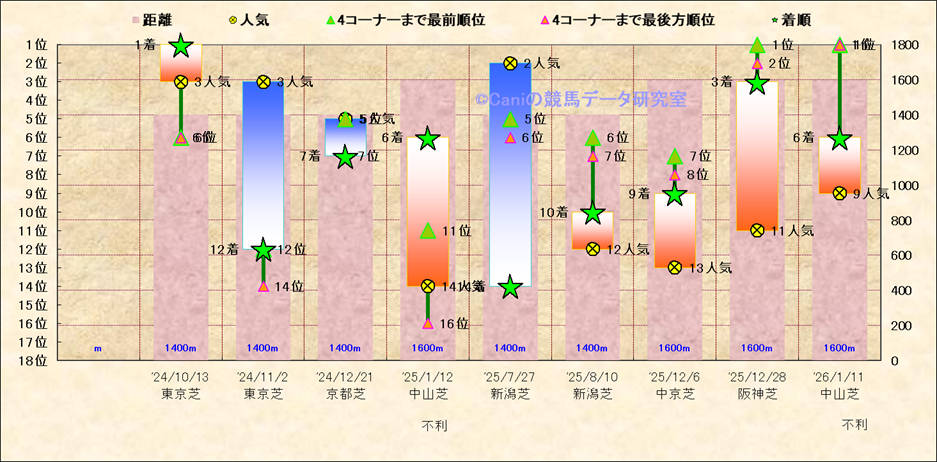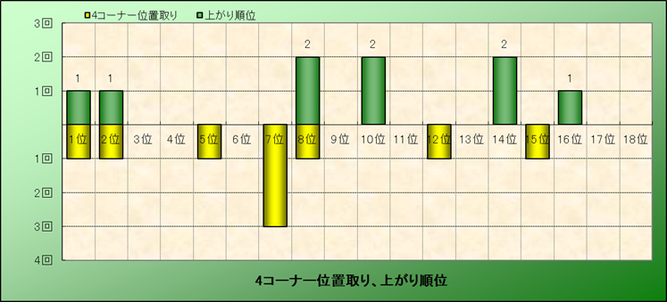 脚質解析 近20レースの4コーナーでの位置取りと上がり順位(頭数補正後) |