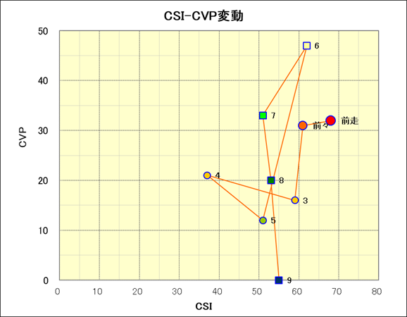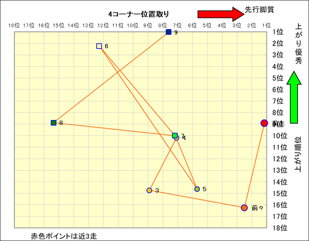 近走における4コーナーでの位置取りと上がり順位(頭数補正後) |