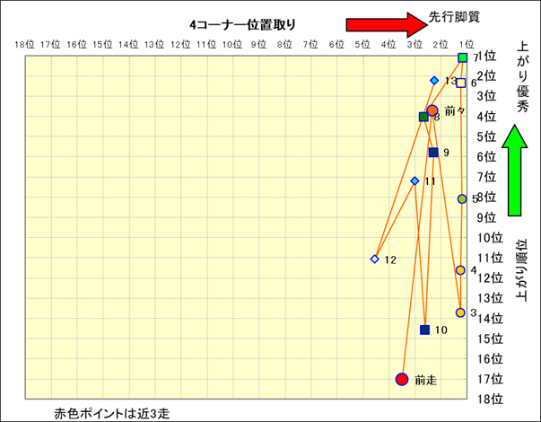 近走における4コーナーでの位置取りと上がり順位(頭数補正後) |