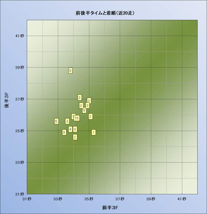 脚質解析 近20レースの4コーナーでの位置取りと上がり順位(頭数補正後) |