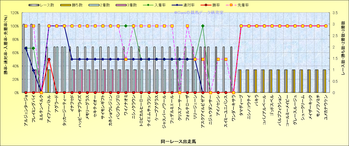 ライバル(相性)解析 同一レースに下記馬が出走した場合の成績とその馬に先着する先着率 |