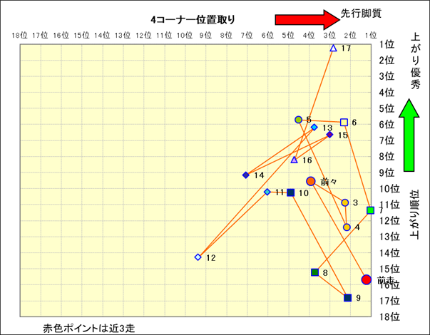 近走における4コーナーでの位置取りと上がり順位(頭数補正後) |