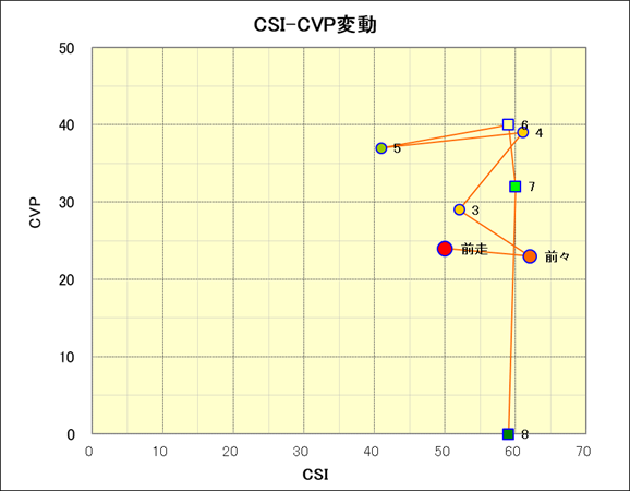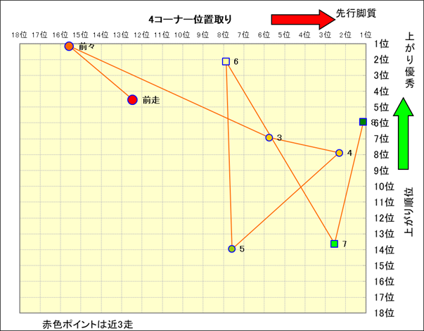 近走における4コーナーでの位置取りと上がり順位(頭数補正後) |