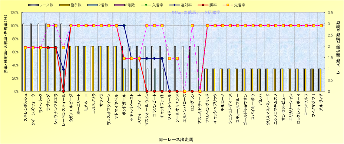 ライバル(相性)解析 同一レースに下記馬が出走した場合の成績とその馬に先着する先着率 |