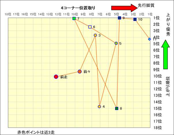 近走における4コーナーでの位置取りと上がり順位(頭数補正後) |