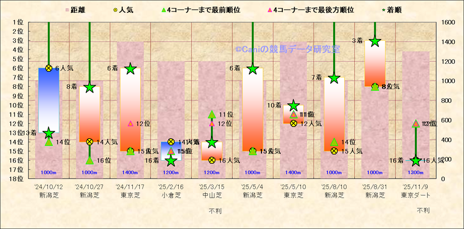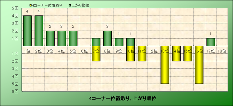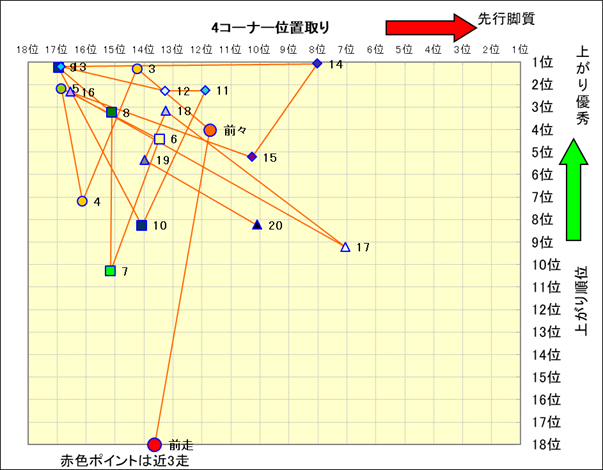 脚質解析 近20レースの4コーナーでの位置取りと上がり順位(頭数補正後) |
