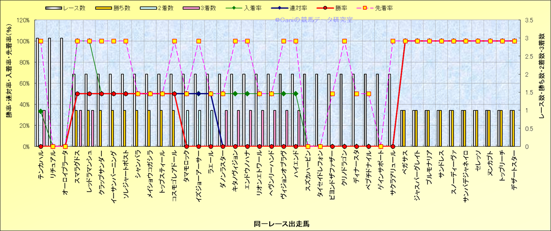 ライバル(相性)解析 同一レースに下記馬が出走した場合の成績とその馬に先着する先着率 |