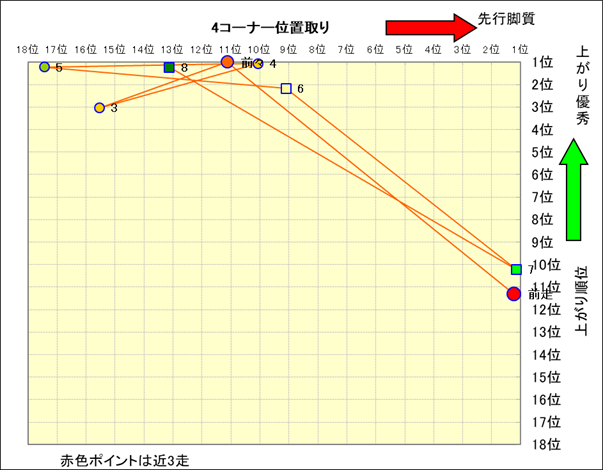 近走における4コーナーでの位置取りと上がり順位(頭数補正後) |
