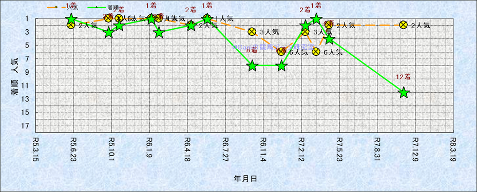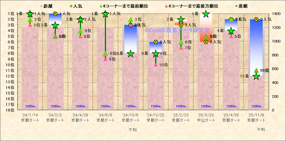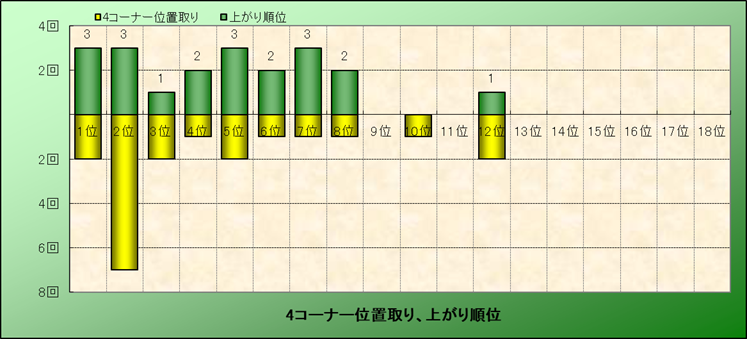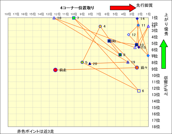 脚質解析 近20レースの4コーナーでの位置取りと上がり順位(頭数補正後) |